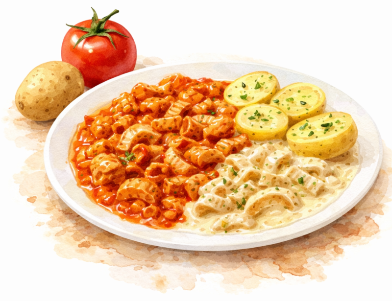 Wählen Sie zwischen würziger Tomatensauce oder feiner weißer Sauce – ganz nach Ihrem Geschmack.