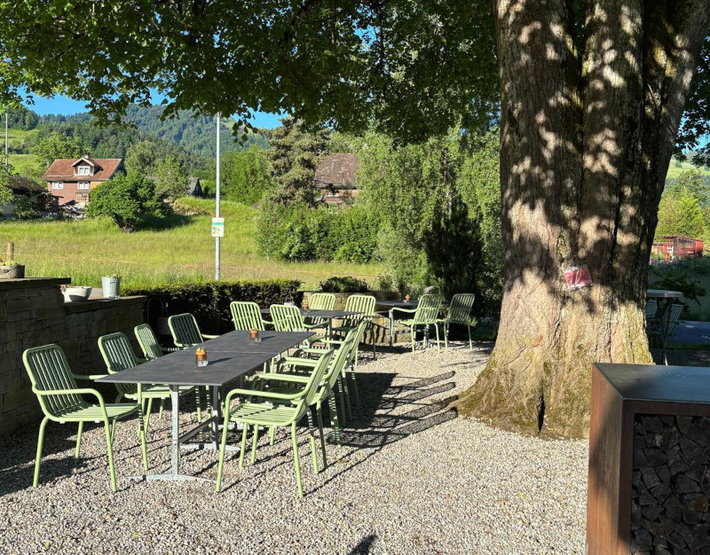 Unter einer großen, alten Linde könnt ihr im Sommer die frische Luft genießen, während sich die kleinen Gäste auf dem Spielplatz direkt daneben austoben.