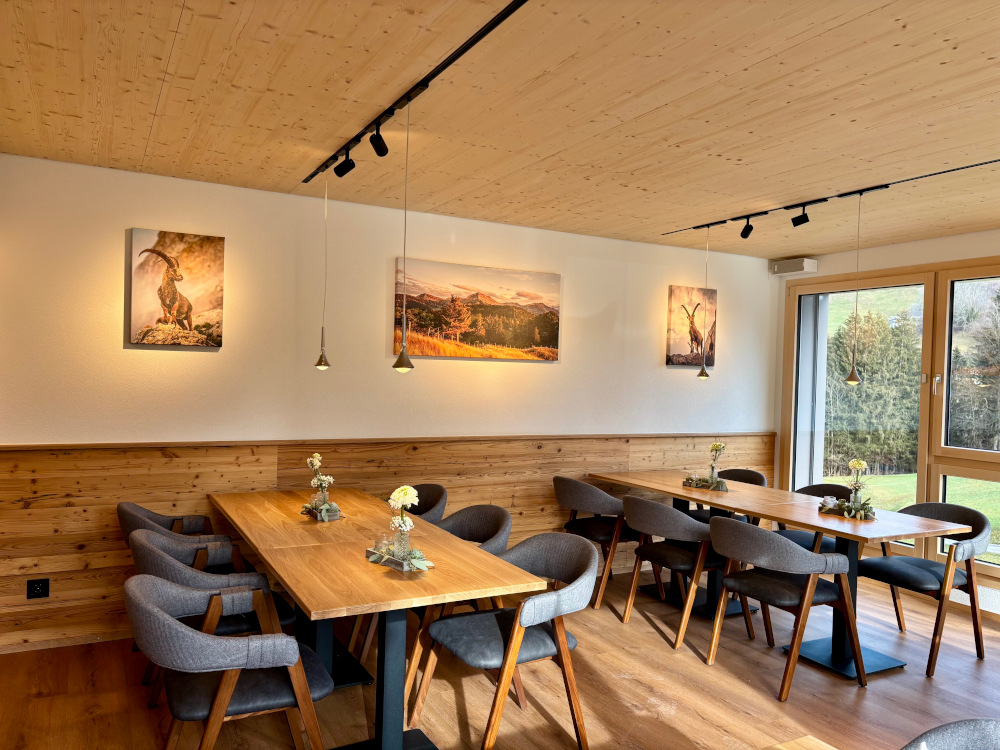 Ein idyllischer Teil des Restaurants mit großen offenen Fenstern und Platz für bis zu 22 Personen. Der moderne, rustikale Stil sorgt hier für eine besondere Atmosphäre.
